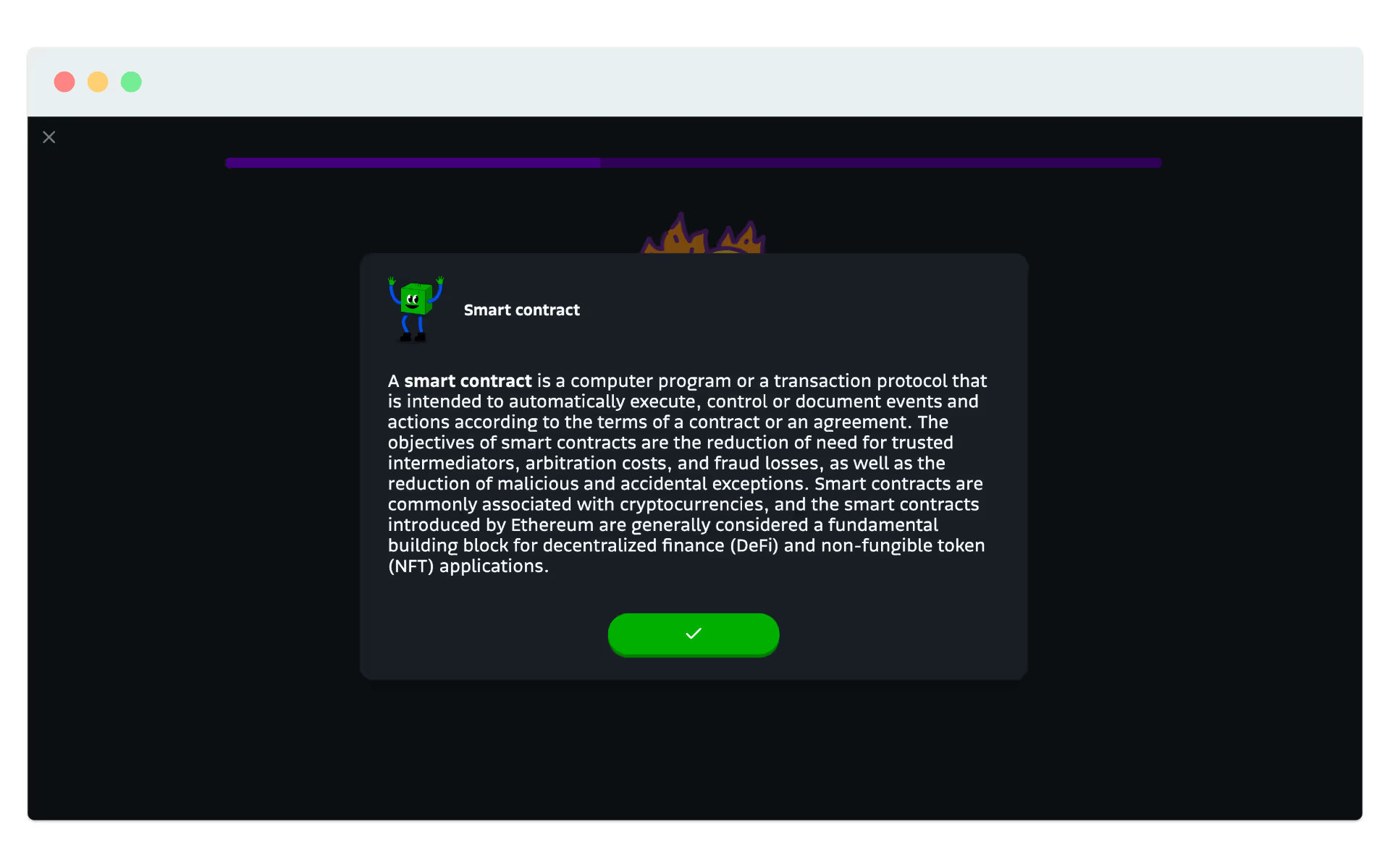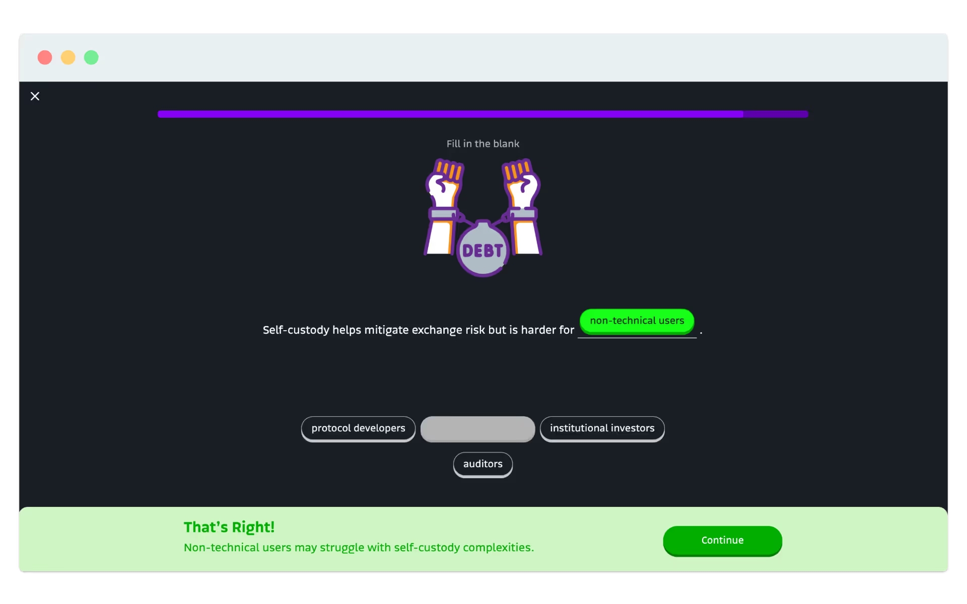 Auch wirtschaftlich war der Ansatz sinnvoll. Eine vergleichbare Akademie intern aufzubauen, hätte Monate an Arbeit von Engineering, Design, Content und QA erfordert, plus laufende Wartung. Jede Ebene - von React-Integration und gamifizierten Mechaniken bis zu Lokalisierung und Analytics - hätte erheblichen Aufwand bedeutet. Durch den Einsatz unseres bereits getesteten und über mehrere Academies verfeinerten Frameworks vermied Bitso dieses Risiko und verkürzte die Time-to-Launch deutlich. Statt das Rad neu zu erfinden, konzentrierte sich das Team auf die richtige Lernstory und die Produkt-CTAs - unterstützt von bewährter Technologie und skalierbaren Workflows für neue Module und Sprachen.